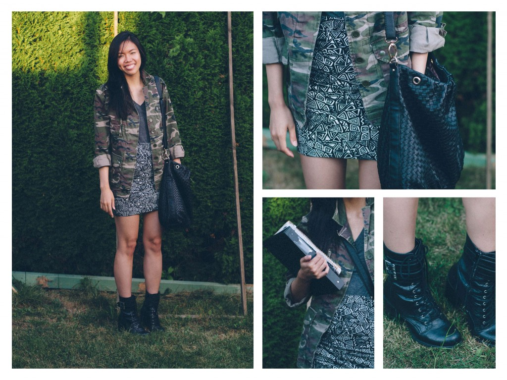 A big trend this past summer and upcoming fall is mixing patterns! This is my first attempt at doing so, so please be easy on me! I decided to match up a camo jacket I recently purchased from Topshop with an old tribal print skirt! I’ve paired it with my fave boots and a large shoulder bag to carry notebooks and binders!