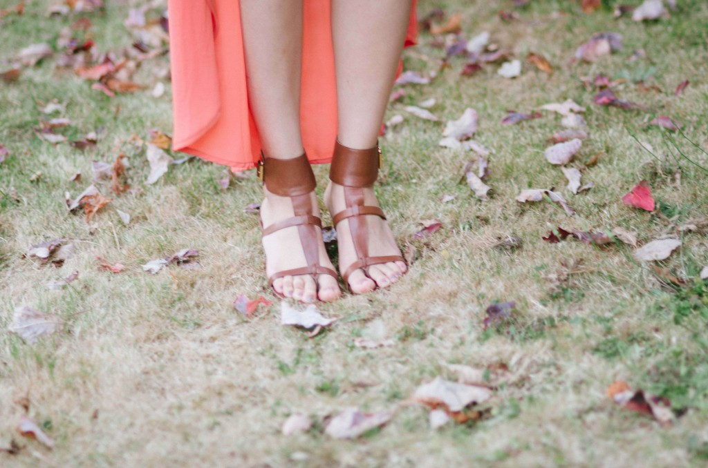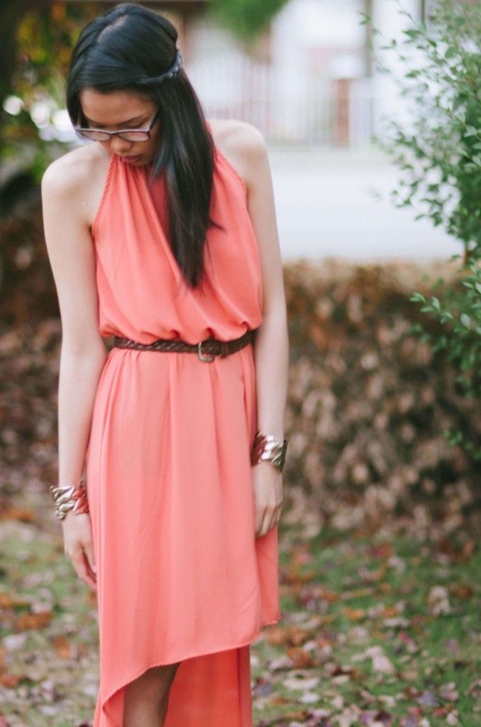 To celebrate the arrival of autumn, I’m sporting an orange high-low dress with brown accents. My outfit kind of matches the fallen leaves!