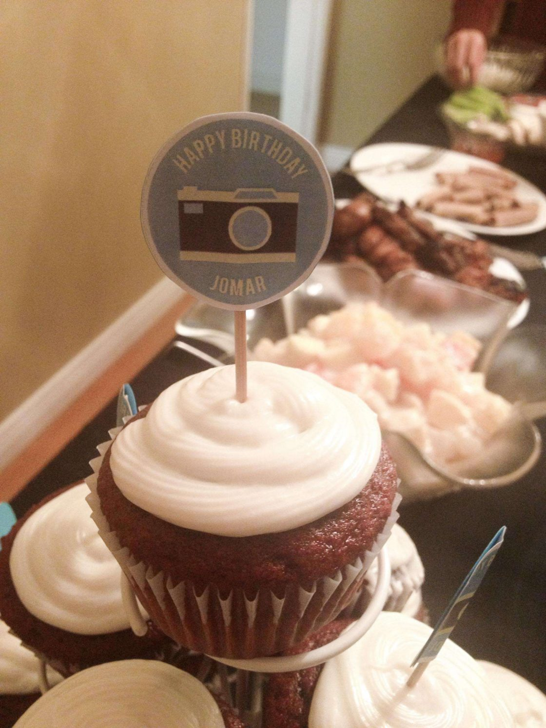 Red velvet cupcakes with a cupcake topper I designed on Illustrator