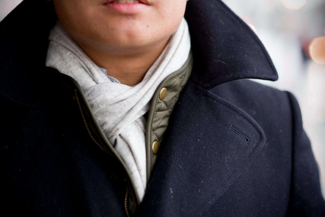 What I’m Wearing.. Pea Coat Club Monaco, Quilted Vest Club Monaco, Button-up Shirt Wings+Horns, Scarf Wings+Horns, Petite Standards A.P.C, Wingtips Cole Haan